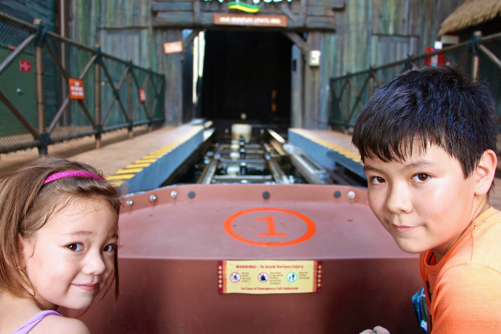 3rd strike - the long awaited river ride. Woo Hoo here we go. Can't wait. Kids got front seat to be in splash zone. Giggles, well worried and nervous laughter type giggles.